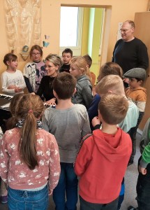 Als Dankeschön gab es dann auch gleich eine kleine Gesangsdarbietung der Klasse 2. Klassen- und Musiklehrerin Frau Sufryd begleitete dazu auf dem neuen E-Piano ihren kleinen Klassenchor, welcher die derzeit bei den Schülern beliebtesten Kinderlieder vortrug.