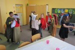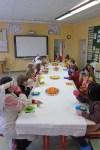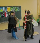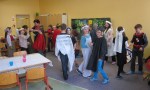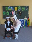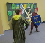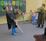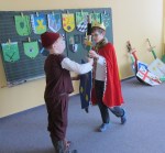 Nachdem sich die Klasse 4 mehrere Unterrichtsstunden mit dem Thema Ritter und Burgen beschäftigt hatte, die Jungs sich Schwert und Schild gebaut hatten, die Mädchen eine Kopfschmuck gebastelt hatten und sich jeder Schüler eine Person ausgesucht hatte, fand am 18.3.2013 ein kleines Ritterfest statt. Der Klassenraum wurde zum Rittersaal und alle Gäste von König Eric und seiner Frau Elisabeth nahmen an einer großen Tafel Platz. Nachdem der Herold alle Gäste vorgestellt hatte, begrüßte der König ebenfalls seine Gäste: Ritter, Handwerker und Bedienstete.Jeder stellte sich und seine Arbeit auf der Burg vor, ob Schmied, Waschfrau, Kammerzofe, Minnesänger, Amme, Hofnarr, Knappe, Ritter, Diener,…..