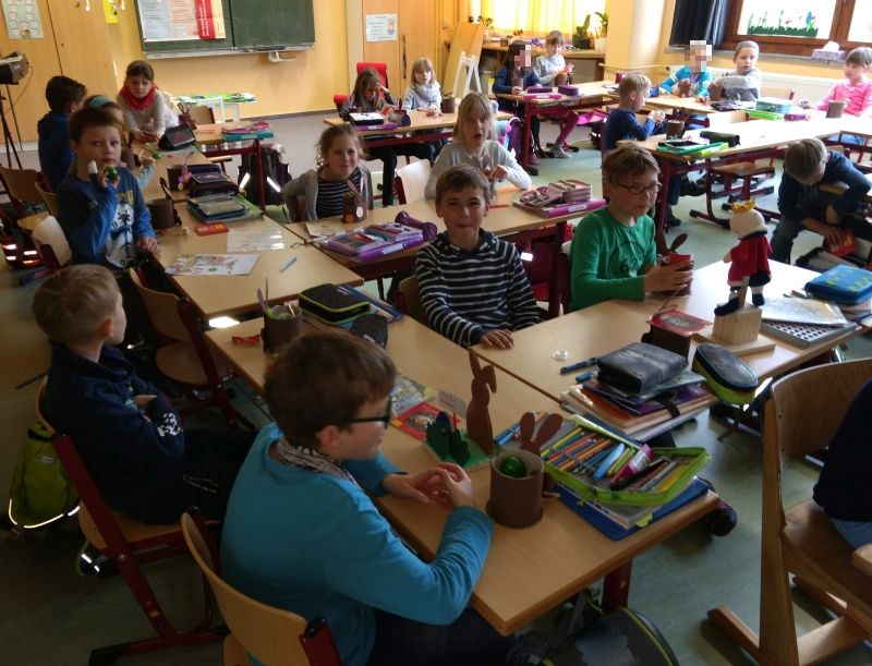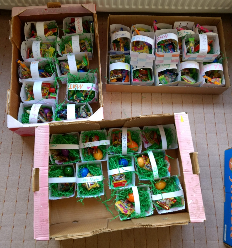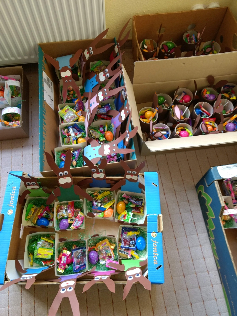 Der Osterhase hatte an unserer Schule wieder viel zu tun. Nachdem jedes Kind im Werkenunterricht sein Osterkörbchen gebastelt hatte, mussten diese nun gefüllt und versteckt werden. Bei 86 Nestern keine leichte Aufgabe!
