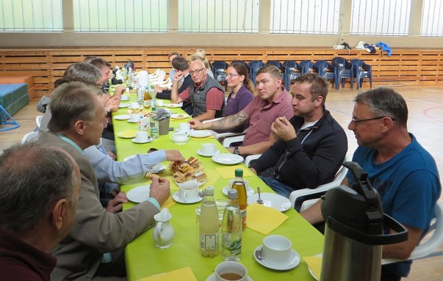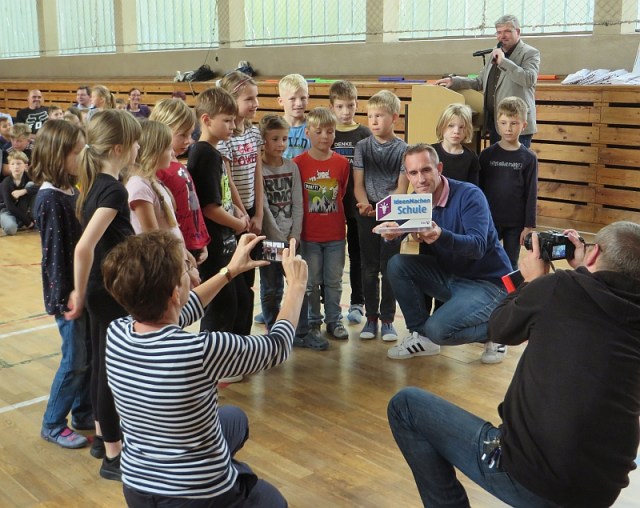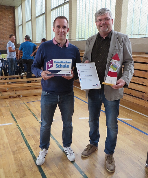 Zu einer Dankeschönveranstaltung hatten die Lehrer und Erzieher der Tälerschule gemeinsam mit den Schülern alle fleißigen Helfer und Unterstützer eingeladen, die mitgeholfen haben, dass unsere Schüler nun trockenen Fußes auf den Schulbus warten können und es keine schmutzigen Schuhe und Ranzen mehr gibt. Bei der Gelegenheit überreichte uns Herr Hildebrandt von der TEAG den Pokal zum „Leuchtturmprojekt“ mit der dazugehörigen Urkunde. Die damit verbundene Prämie in Höhe von 1000 € wurde mit für den Bau des Wartehäuschens verwendet.