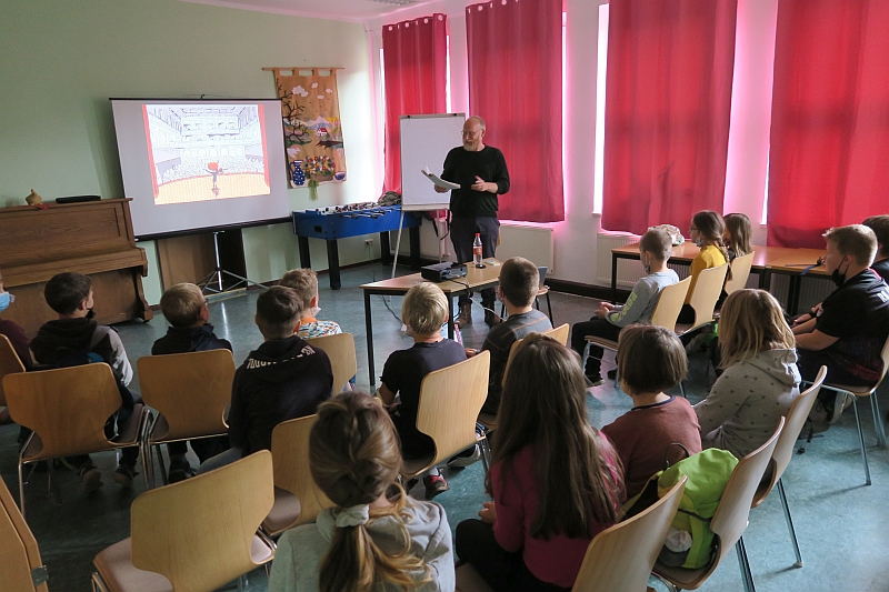 Die Klasse 4 der Tälerschule Ottendorf war im Rahmen der „Litera-Tour“ zur Buchlesung in das Brehm-Schullandheim eingeladen. In dieser Lesung stellte der Kinderbuchautor und -illustrator Alexander von Knorre sein neues Kinderbuch mit dem Titel „Kissenschlacht im Nachtexpress“ vor.