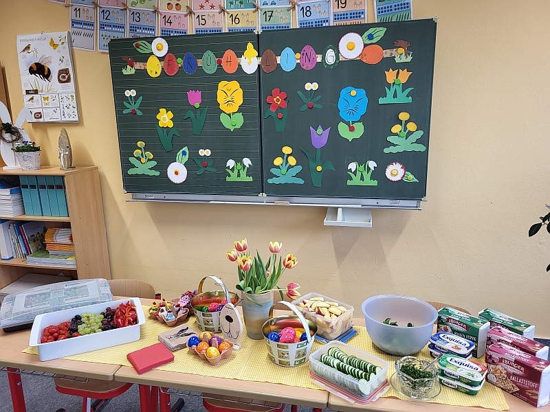 Rund um das Thema Ostern und Gesundes Frühstück ging es im Osterprojekt der Klasse 2 in der Woche vor den Osterferien. Leckeres Obst und Gemüse sowie Knäckebrot mit Frischkäse, Schnittlauch und Feldsalat (frisch geerntet aus dem Schulgarten!) gab es am ersten Projekttag zu verkosten.