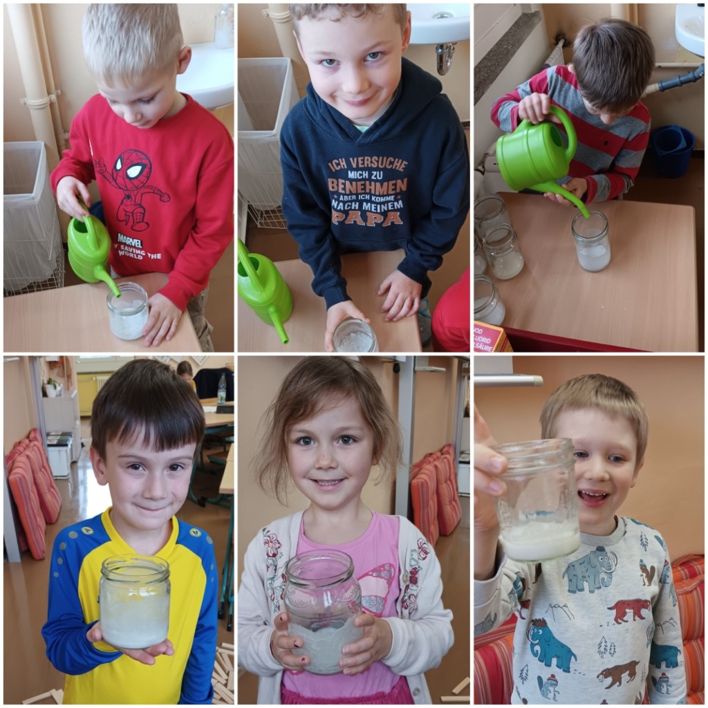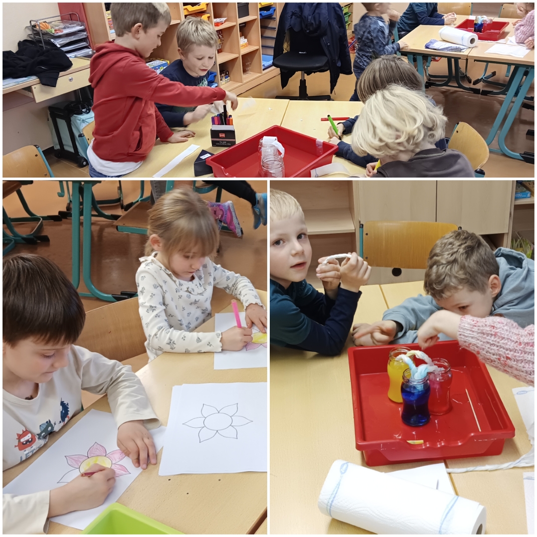 Zum Thema „Experimente mit Farben und Wasser“ führten die Hortkinder der Klasse 1 verschiedene kleine Experimente an mehreren Stationen durch: