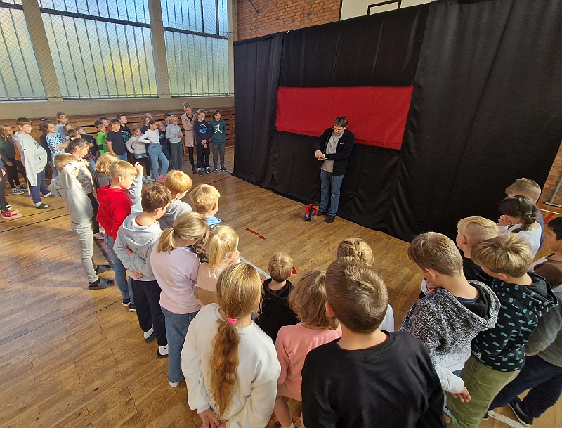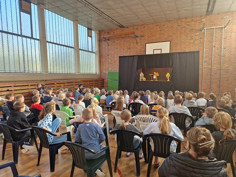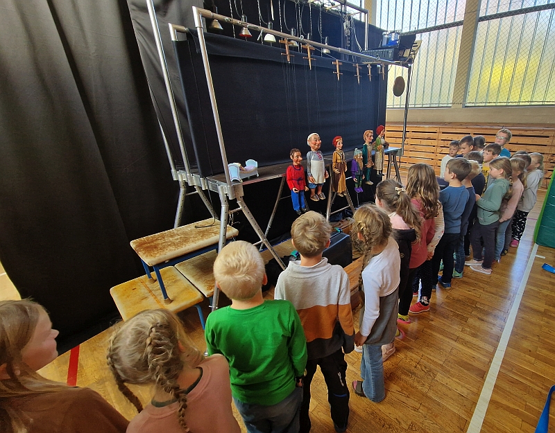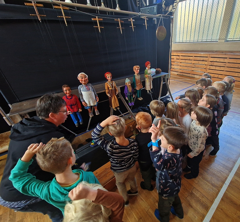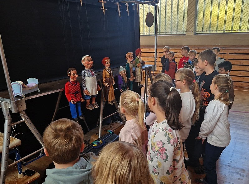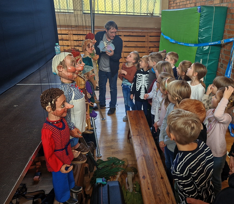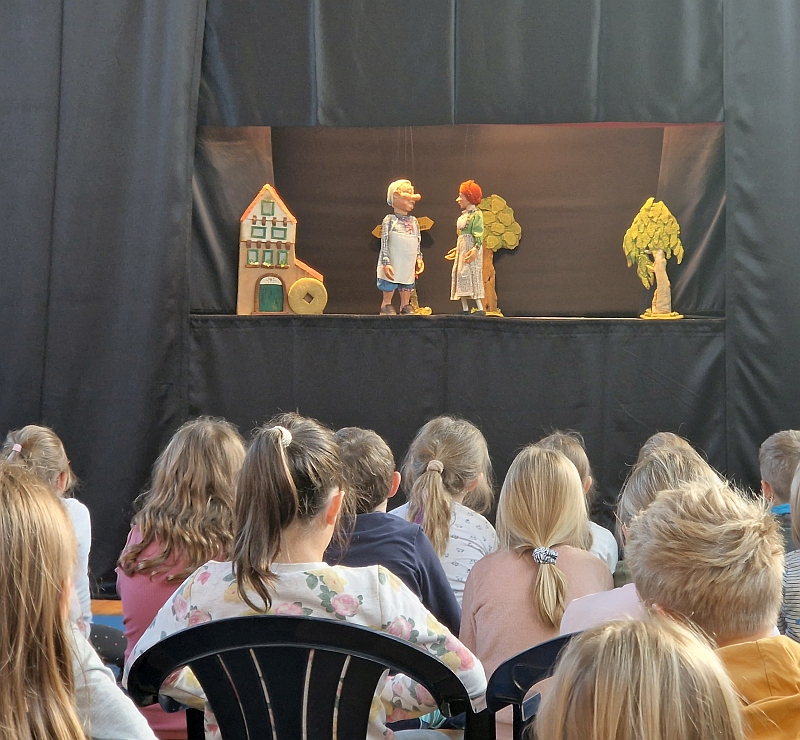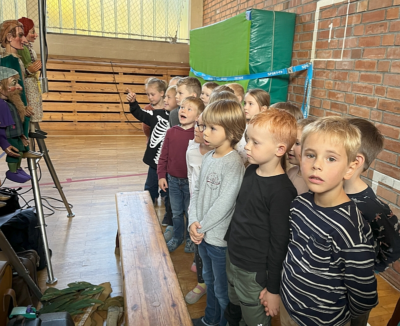 In diesem Jahr konnten wir wieder das „Marionettentheater Bille“ aus Leipzig begrüßen. Auf dem Spielplan stand das Märchen „Rumpelstilzchen“. Wie gewohnt durften die Kinder nach der unterhaltsamen Vorstellung auch einen Blick hinter die Kulissen werfen um die Bühne und die Puppen genauer zu betrachten. Zum Abschluss ließ Herr Bille eine Puppe vor der Bühne laufen und erklärte die Funktionsweise der einzelnen Fäden, die an der Marionette angebracht sind.