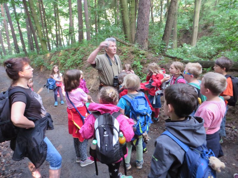 Zum Wandern in den Wald hatten sich die Schüler der Klassen 1 und 2 mit dem Ottendorfer Jäger Herrn Birke verabredet.