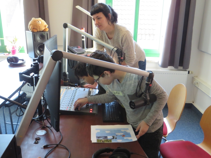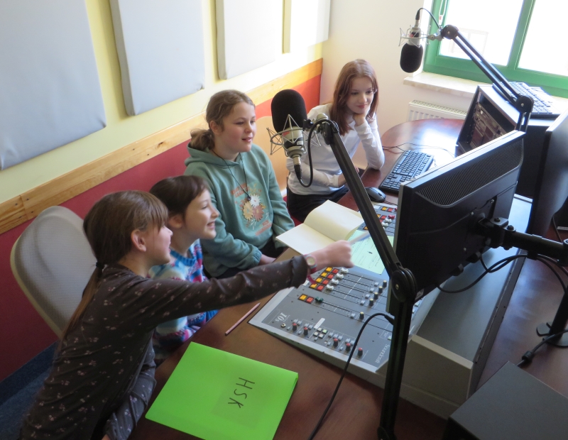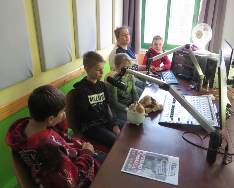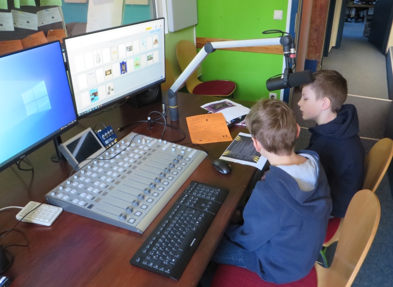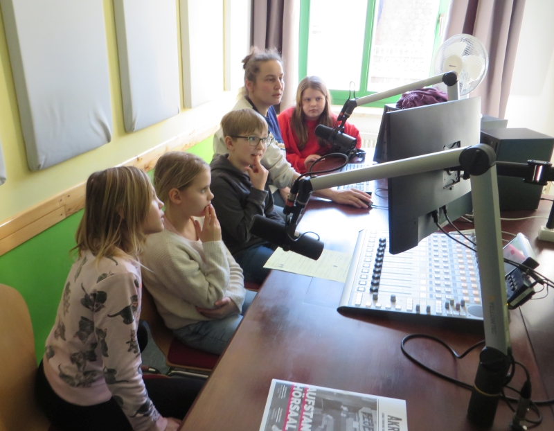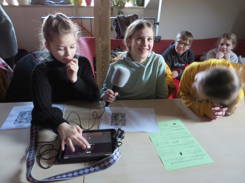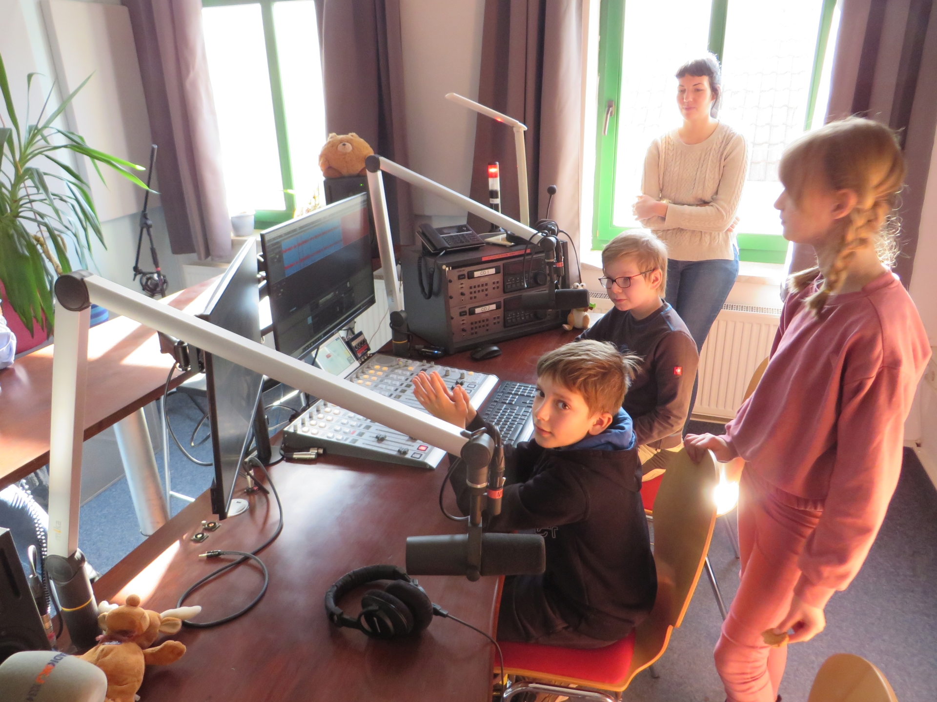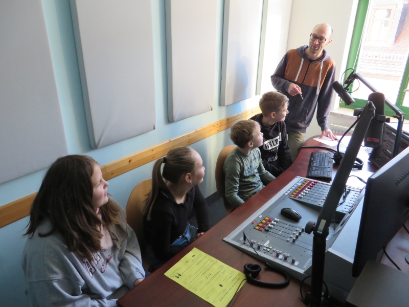 Mit dem Bus fuhren die Schüler nach Jena, um sich einmal in einem Radiostudio umzusehen und natürlich selbst die Texte für die neuen Kinder-Audioguides aufzunehmen. Die Radioleute nahmen in 4 verschiedenen Studios die von den Kindern eingesprochenen Dialoge, aber auch selbst erfundene Raps und Lieder auf.Dabei durften die Schüler sich selbst im Aufnehmen, Schneiden und Mischen der Aufnahmen üben, was allen viel Spaß machte.