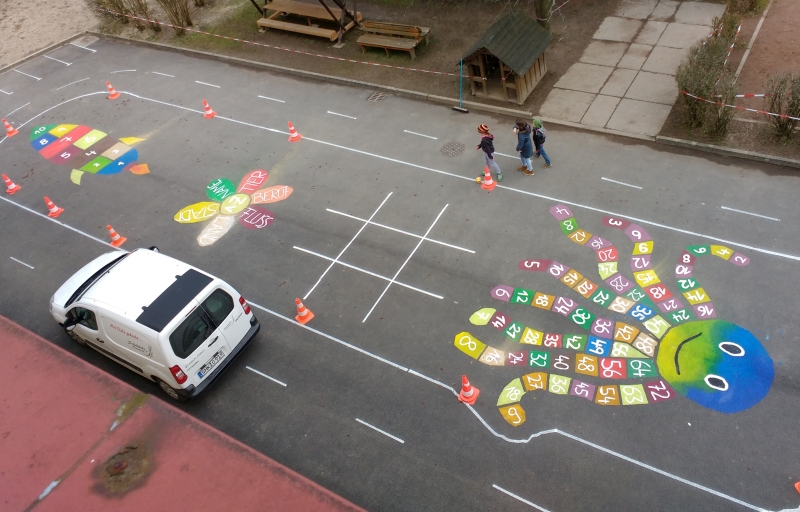Dank unserer Praktikanten bekam unser Schulhof nun auch noch einige Spielflächen und eine „Fahrbahn“ für die „Fahrzeuge“ der Hortkinder! Vielen Dank an Lena, Lilli und Leon!