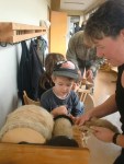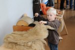 Frau Schlegel und Frau Adler zeigten an ihrer Station, wie man an einem Webrahmen webt und wie aus Schafwolle ein Faden gesponnen wird. Die Wolle wurde zu erst auch gekämmt und es versuchten sich auch Kinder am spinnen und Weben.